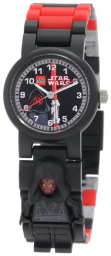 LEGO Star Wars Darth Maul Mini-figure Link Watch. Perfect for young or old Star Wars fans, the LEGO Kids' Star Wars Darth Maul Watch features a fun, colorful dial with a cartoon image of Darth Maul and his interconnected lightsabers. The white hour and minute hands and Arabic numeral hour indexes make it fun to tell time. You can customize the watchband with interchangeable links. Plus, the watch comes with a Darth Maul LEGO mini-figure. The LEGO Kids' Star Wars Darth Maul Watch is powered by Japanese quartz movement and features a scratch-resistant mineral crystal so not only does it look cool, it's reliable and durable. It's also water-resistant to 165 feet (50 meters). Batteries and instructions included. Dimensions: 9.00" L x 1.00" W