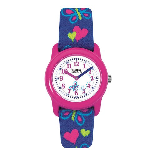 The Timex T89001 Youth watch is reliable, durable, and readable in the dark, thanks to the integrated Indiglo night-light, but it's also flat-out fun to wear. This quartz analog watch features an easily readable, full Arabic numeral display and smaller 5-minute notations on the outside of the dial. It also has a small butterfly that rotates around the dial with the hands, and a comfortable elastic fabric strap (for better dirt and stain resistance) with butterflies and hearts against a blue base. This watch also offers water resistance to 30 meters (99 feet), durable pinkish red resin case, different colored hour and minute hands, and Timex's unique Kids Loss Protection Plan. It's recommended for children ages 6 and older.